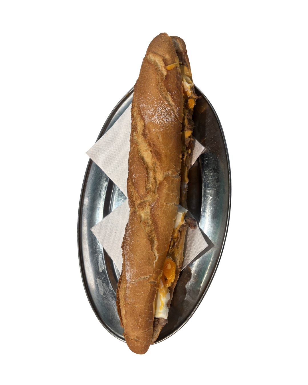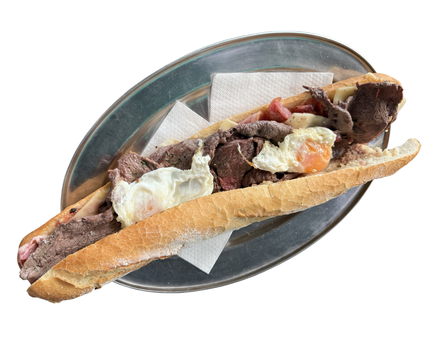 Lomo plancha, bacon, tomate, lechuga, mayonesa y huevo frito de cobardes y gallinas
