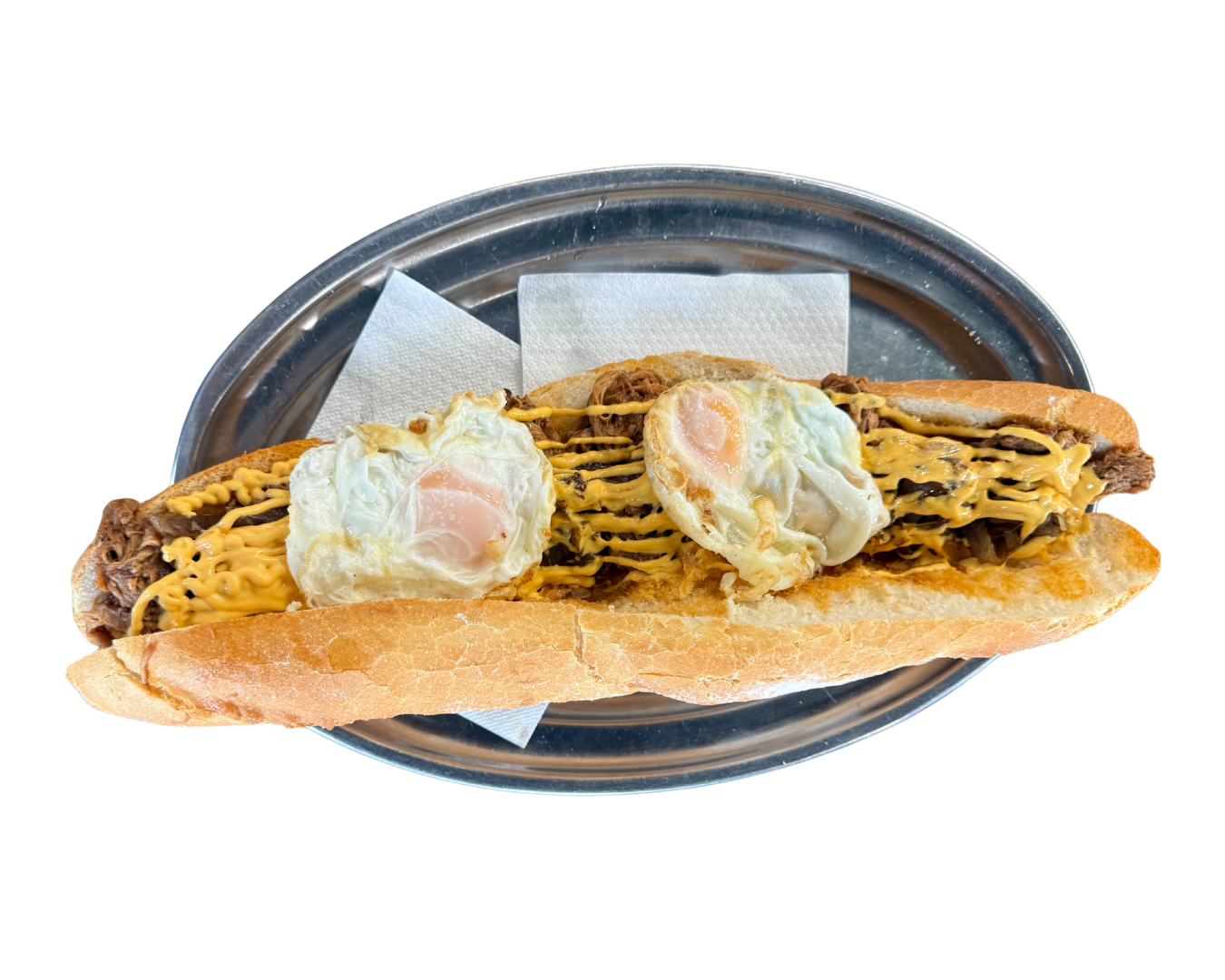 Pull pork de costillas y carrillada, cebolla caramelizada, fundido de cheddar y 2 huevos fritos de cobardes y gallinas